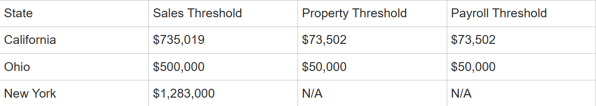 For architecture firms, this is particularly relevant when providing services to clients in other states. Exceeding any one of these thresholds can create nexus*, triggering a filing requirement. These thresholds vary significantly by state, as shown in the table below: