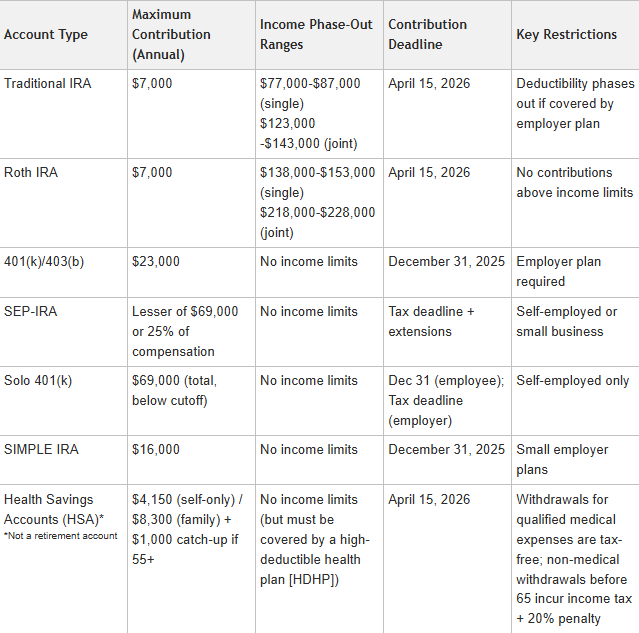 Top off your 401(k), Roth IRA, or SEP-IRA before the deadlines. These accounts are your most powerful legal tax shelters.