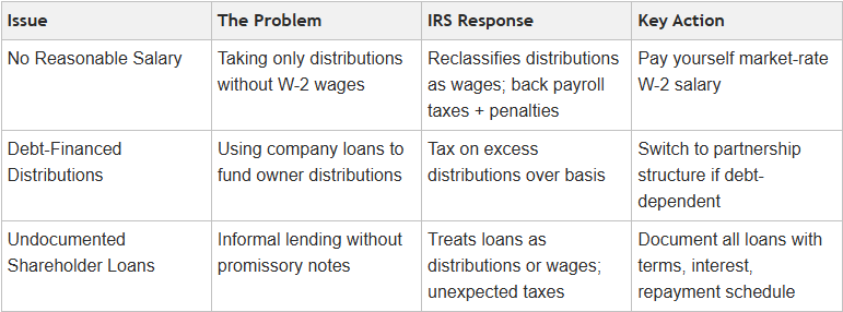 Salary Reclassification: If you didn't take a reasonable salary, the IRS can reclassify your distributions as wages. You'll owe back payroll taxes on Social Security and Medicare, plus penalties and interest.